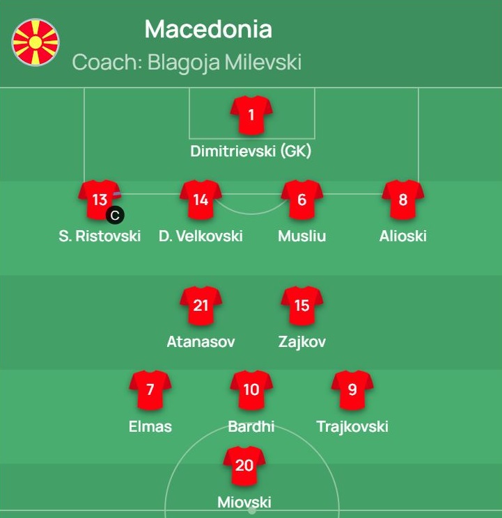 Пред Димитриевски во одбранбената линија се С. Ристовски, Д. Велковски, Муслиу и Алиоски, а на средината ќе делуваат Зајков и Атанасов (како алтернатива за Адеми).