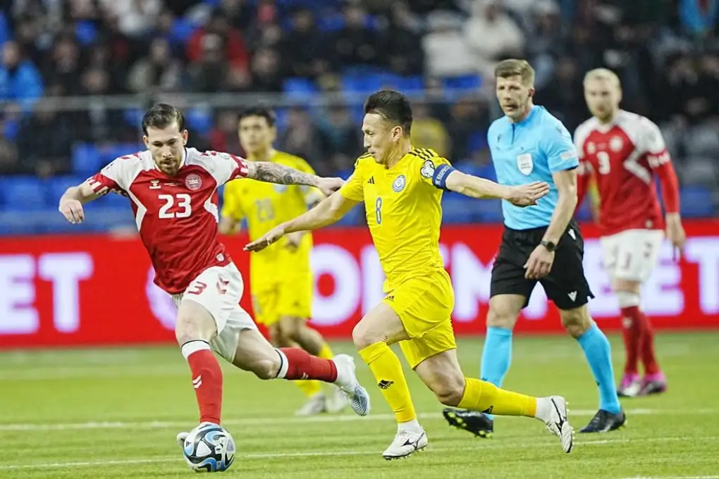 Иако со двата гола на Хојлунд (21 и 36-минута) Данците го добија првиот дел со 0-2, сепак во вториот селекција на Казахстан доминираше и заслужено на крајот се радуваше. За само петнаесетина минути домаќините постигнаа три гола преку, Зајнутдинов од пенал (73-минута), Тагиберген (86) и Ајмбетов (89) и со целосен пресврт славеа со конечни 3-2.