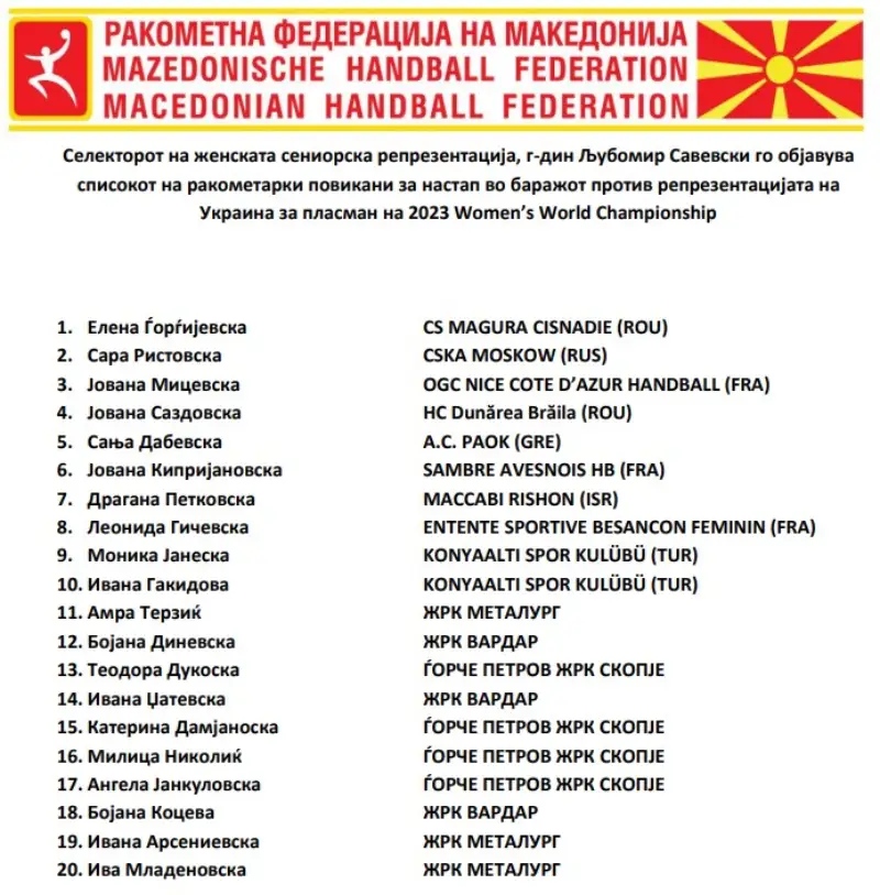 Селекторот Љубомир Савевски кој пред извесен пориод го објави поширокиот список на кој беа 35 ракометарки, денеска го скрати и избра 20 кои ќе конкурираат за настап на двата меча со Украинките.