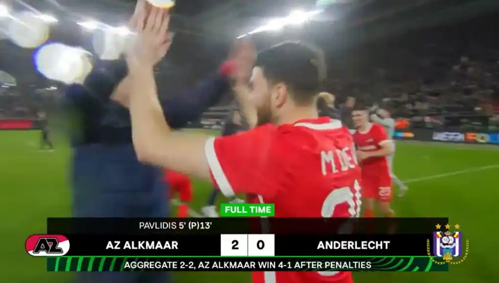 Многу радости за екипата на Аз Алкмар која ја анулира негативата од 2-0, по првиот натпревар со Андерлехт, за по пенал рулетот да се пласираат во полуфиналето на Конференциската лига на УЕФА.
