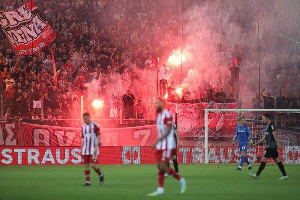 Olympiakos fans storm the pitch targeting rockets and flares towards the bench area! 🚨