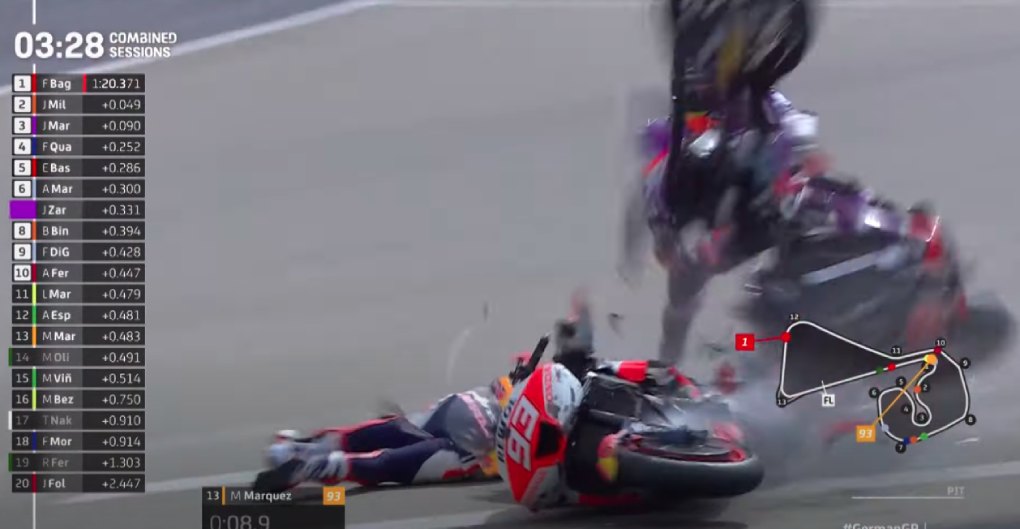 Поради големата брзина при сударот на моторите, оној на Зарко буквално беше преполовен. Среќа и двајцата возачи поминаа без посериозни последици.