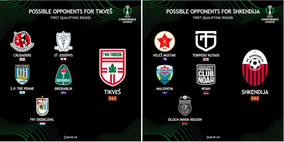 Кавадарчани пак, Тиквеш, за противник би добиле некоја од следните екипи: Бреидаблик (Исланд), Дуделанж (Луксенбург), Тре Пене (Сан Марино), Сент Јозеф (Гиблартар) и Крусеидерс (Северна Ирска).