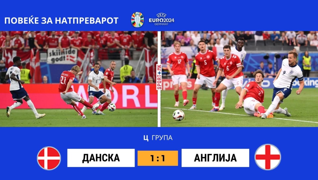 Топ фаворитот за шампионскиот трофеј на ЕУРО 2024-та, Англија не ја оправда улогата во дуелот со Данска. Натпреварот од 2.коло во „Ц “ групата, одигран во Франкфурт, заврши без победник 1-1.