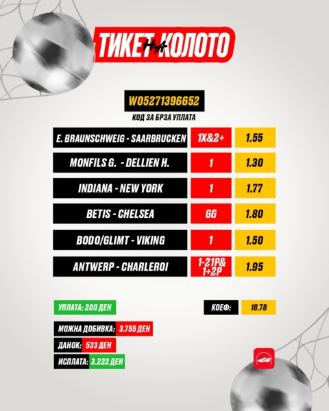 Нашиот влог стандардно е 200 денари, првиот натпревар на тикетот почнува вечерва во 20:30 часот, така што имате време дотогаш да ја искористите шифрата за брза уплата доколку сакате да ја одиграте нашата визија.