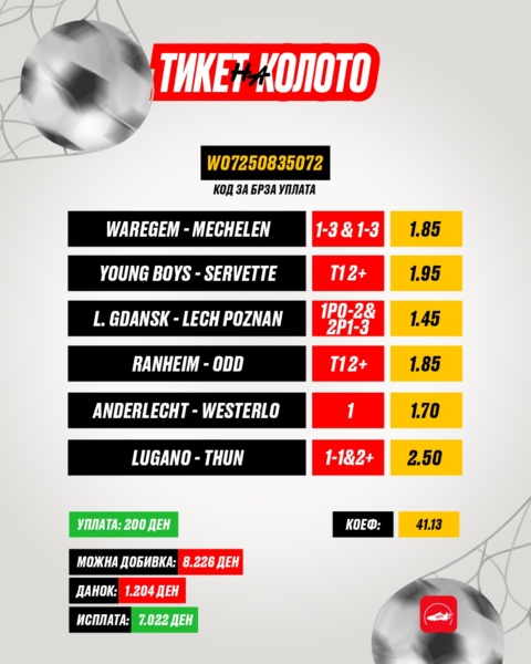 За да зголемиме коефициент и да „удриме машки“ за последен пар на тикетот, типуваме дека Лугано ќе победи, но ќе води и на полувреме, а кога се во прашање головите ќе има минимум два. Коефициентот е одличен и ни носи големо заокружување на потенцијалната добивка.