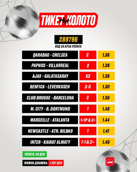 Затоа и подготвивме тикет за денес со кој освен што целиме на добивка, целиме и на 1000 евра со само едно евро уплатено.