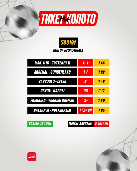Кодот за тикетот е: 700191, a доколку ти се допаѓа можеш да го одиграш до 15:29ч во сабота, бидејќи првиот натпревар започнува минута подоцна