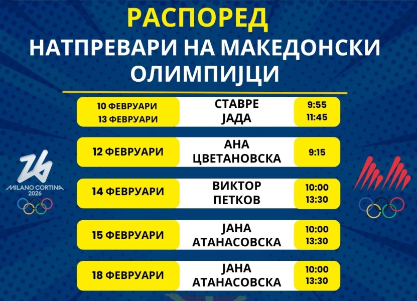 Прв на олимписките терени ќе се појави нордиецот Ставре Јада кој како и алпинката Јана Атанасовска ќе имаат по два настапи.