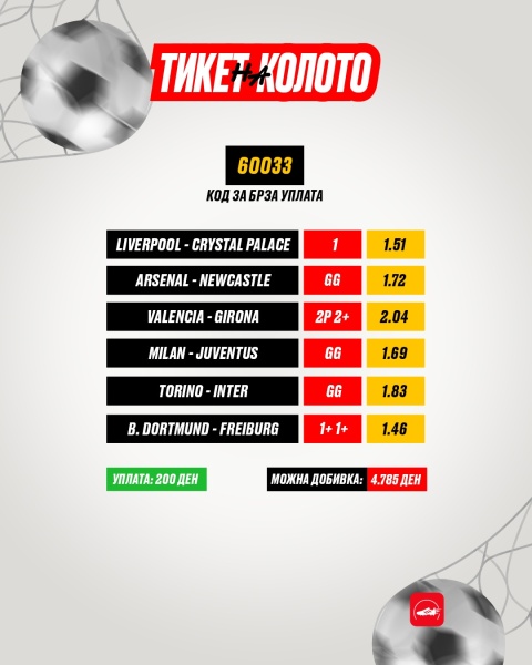 Но сега, добивката веруваме дека нема кај да бега, па затоа подготвивме 6 нови парови, а ние те советуваме да го уплатиш утре од 9 до 11 часот, бидејќи ќе добиеш и 10% поголема добивка поради HAPPY HOUR викенд бонусот во сите обложувалници на Златна Копачка.